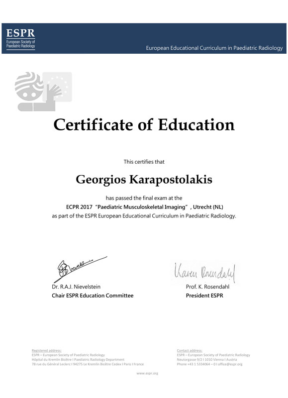 - Πανευρωπαϊκό Δίπλωμα εκπαίδευσης στην Παιδιατρική Απεικόνιση του Μυοσκελετικού (ECPR 2017″ Paediatric Musculoskeletal Imaging”)μετά από γραπτές εξετάσεις.