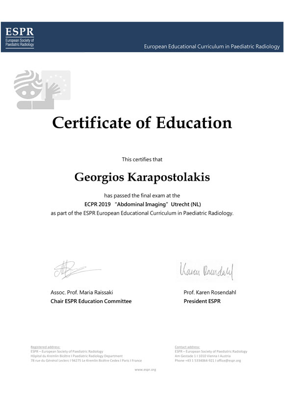 - Πανευρωπαϊκό Δίπλωμα εκπαίδευσης στην Απεικόνιση της κοιλιάς (ECPR 2019″ Abdominal Imaging”) μετά από γραπτές εξετάσεις.