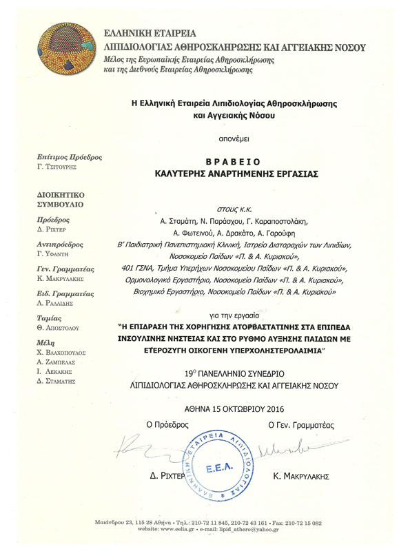 - Επιστημονικός Συνεργάτης του Ιατρείου Διαταραχών λιπιδίων της Β’ Πανεπιστημιακής Παιδιατρικής κλινικής του Νοσοκομείου Παίδων «Παναγιώτη και Αγλαΐας Κυριακού», Υπεύθυνη: Αναπληρώτρια Καθηγήτρια της Παιδιατρικής κα Γαρούφη Αναστασία
