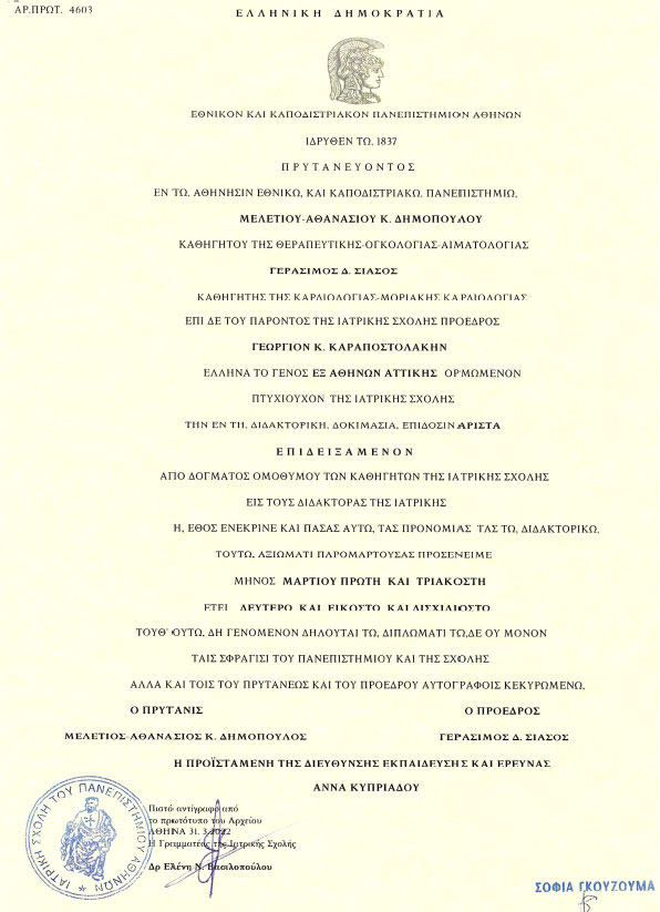 Διδάκτωρ Ιατρικής Σχολής Πανεπιστημίου Αθηνών