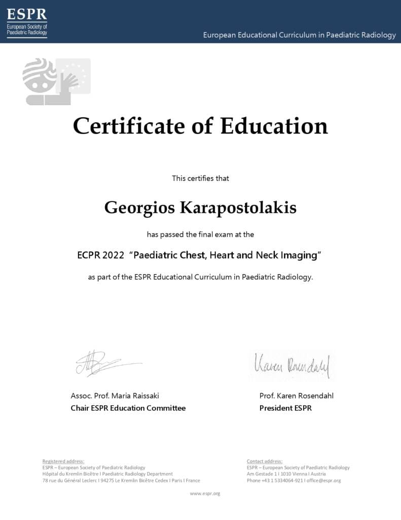 - Πανευρωπαϊκό Δίπλωμα εκπαίδευσης στην Παιδιατρική Απεικόνιση Θώρακος, Καρδιάς και Τραχήλου (ECPR 2022“Paediatric Chest, Heart and Neck Imaging”).